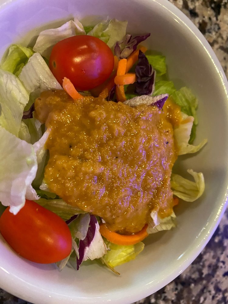 Crisp greens, red cabbage, carrots and grape tomatoes in a homemade tangy ginger dressing.