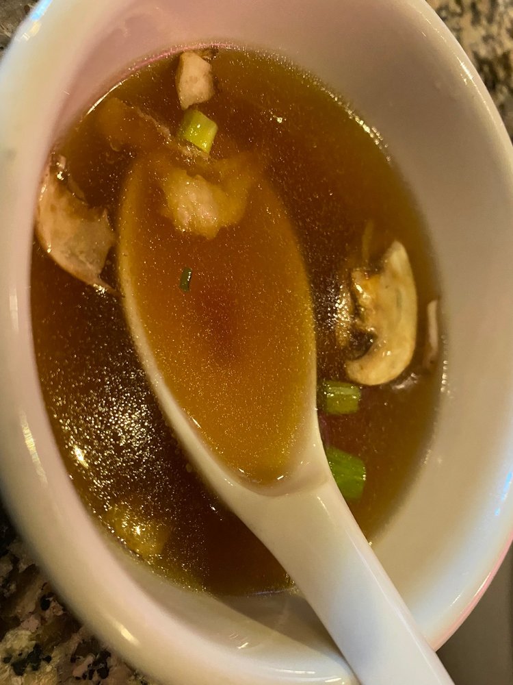 Soy pork broth (tonkotsu soy), chicken ramen noodles, half of a soft boiled egg, naturo, green onions, spicy garlic chips, sesame seeds and nori.